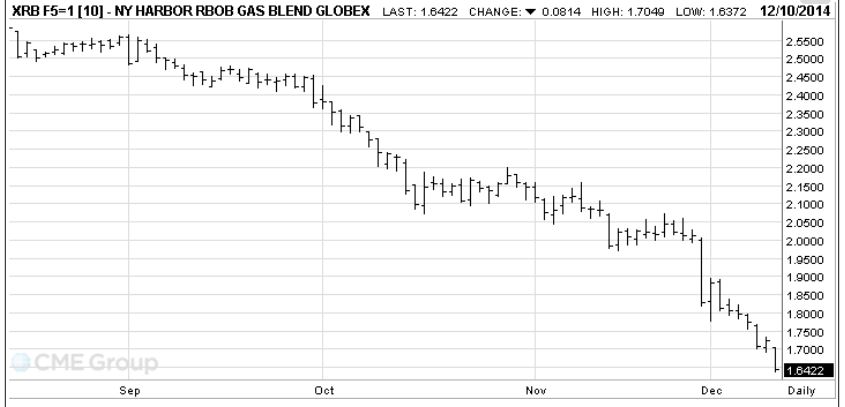 RBOB Gasoline” is trading at the equivalent of around $1.64 per gallon. As shown in the following graph, this represents a price drop of roughly 85-90 cents per gallon since September: